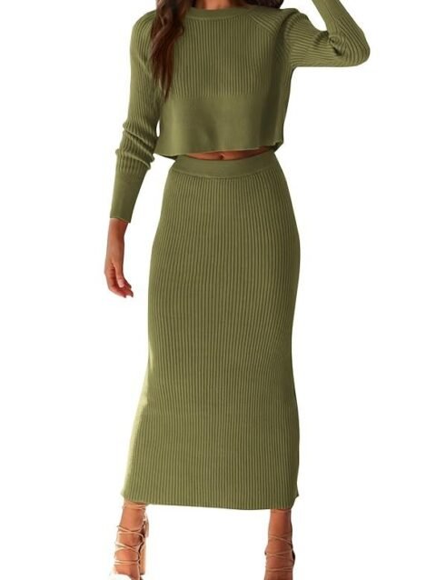 Women’s Fall 2 Piece Sweater Set Rib Knit Long Sleeve Crop Top Maxi Bodycon Skirt Casual Winter Outfits