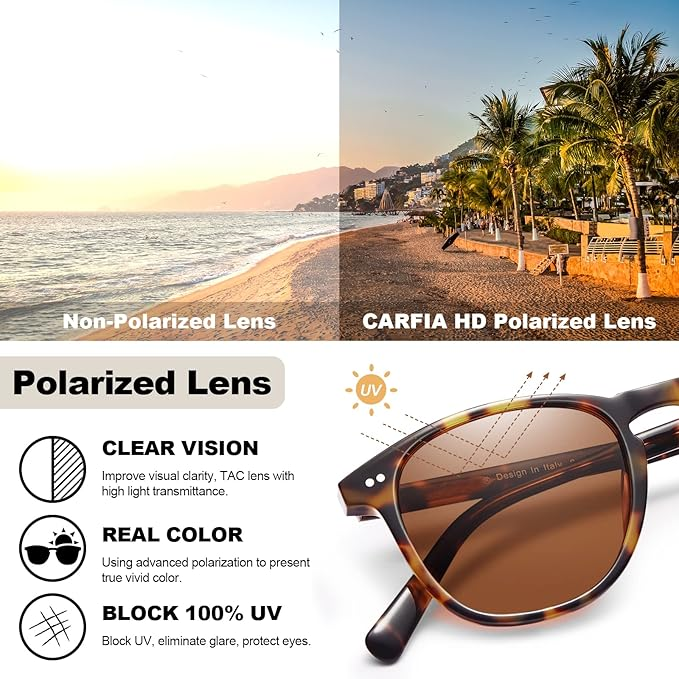 - 100% UV Blocking – Carfia polarized sunglasses for women block 100% harmful UVA/UVB rays and blue light up to 400nm. They are essential to protect your eyes against long-term UV damage and keep eyes healthy when going out.