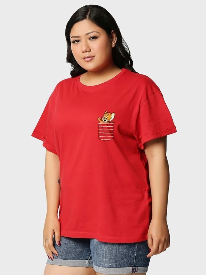Official Tom & Jerry Merchandise Women’s 100% Cotton Graphic Print Boyfriend Fit Round Neck Plus Size T-Shirt