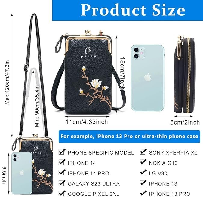 - Crossbody Phone Bags for Women Size: 7.1″(H) x 4.37″(L) x 1.96″(W), erfect size to storage your phone, napkin paper, lipsticks, mascara, coins, cards, keys, ect. Lightweight and easy to carry.