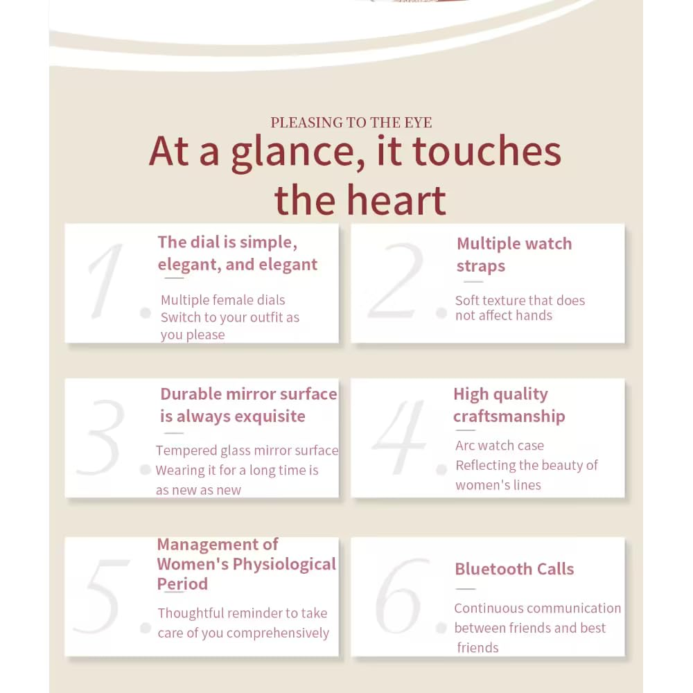 - DISPLAY FEATURES: 💍 1.32-inch AMOLED screen delivers crisp visuals in an elegant, 10mm slim, and lightweight design perfect for feminine wrists. Replaceable band with 100+ uniquely designed watchfaces make sure that you always have looks matching to every occassion. AMOLED Screen supports beutiful Always On Display.