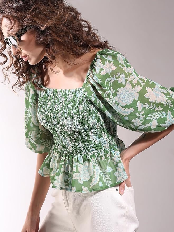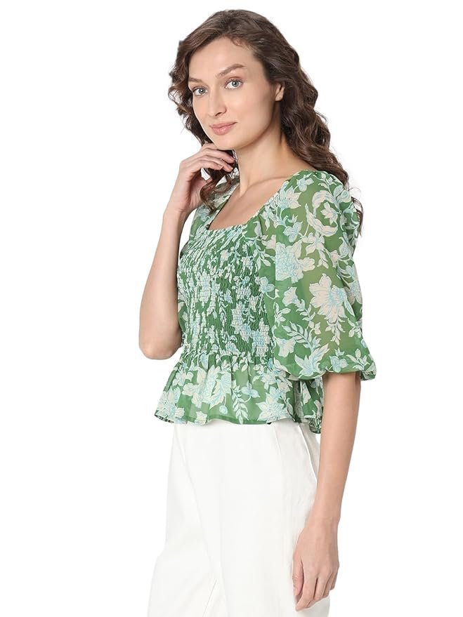 VERO MODA Floral Printed Puff Sleeve Cinched Waist Crop Top