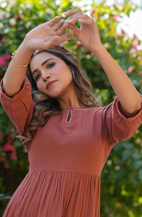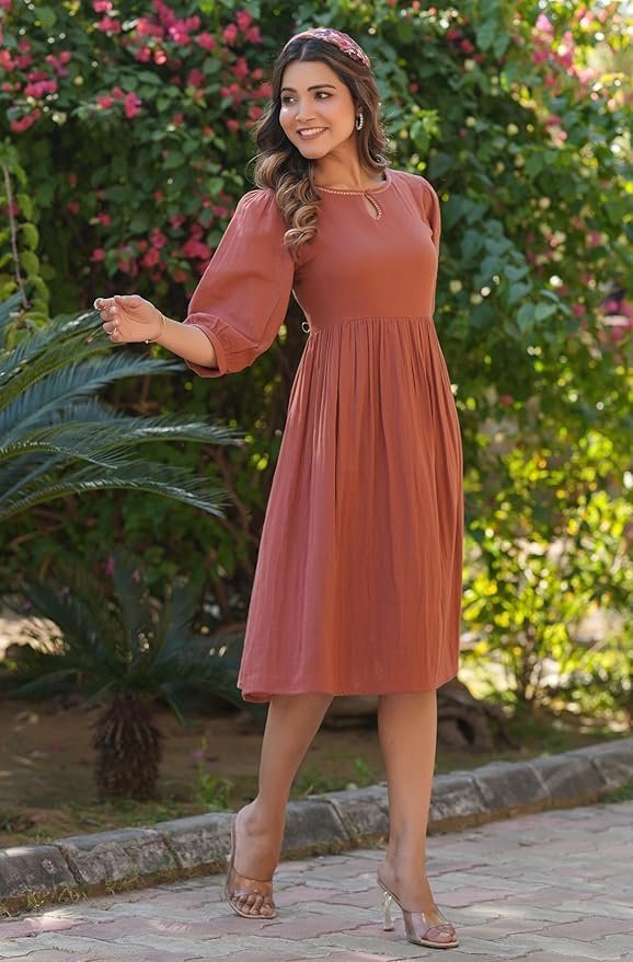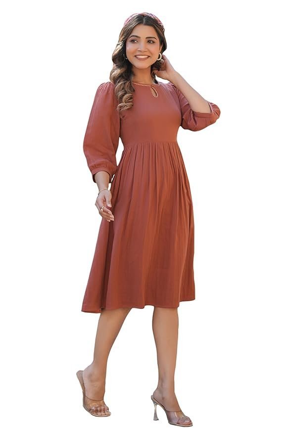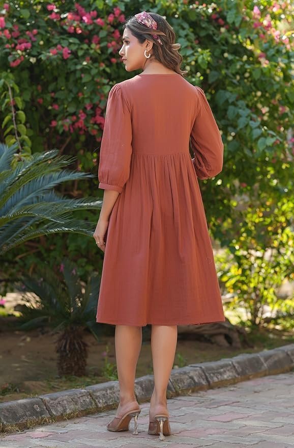 Women’s Rust Orange Pure Cotton Solid Fit & Flare Dress
